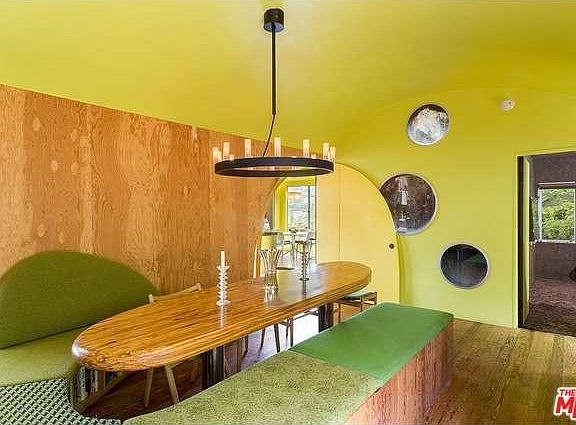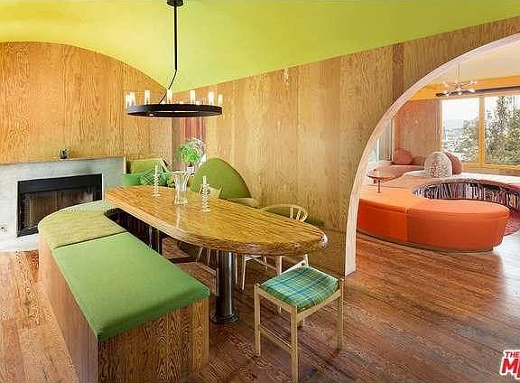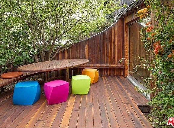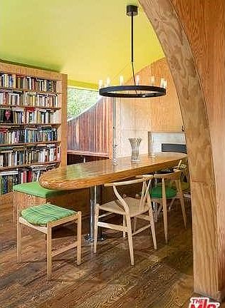 A thoroughly original blend of architectural styles, this 1925 Spanish was reinterpreted by designer Fritz Haeg in 2004. Homeowner, David Bernardi admired R.M. Schindler's Falk Apartments across the street, and enlisted Haeg to create a wholly original work by combining L.A.'s Spanish history with modernism. A close collaboration developed between Bernardi and Haeg who describes the project as a "cubic wrapper with cut corners." The white stucco facade containing mica dust sparkles when viewed from different angles. The living and dining rooms contain custom built-ins and fabrics, including a table carved from glued laminated wood, custom media room with surround sound, six-foot long sink in the master bath with spa size shower and tub, Philipe Starck, Hansgrohe and Duravit fixtures throughout, and separate gym/guest area. The black pebble-lined pool is perfectly situated at the edge of the back terrace with views of the Hollywood sign, Griffith Park Observatory and the hills beyond.