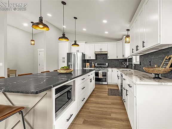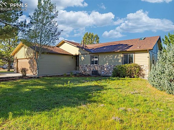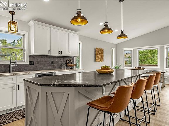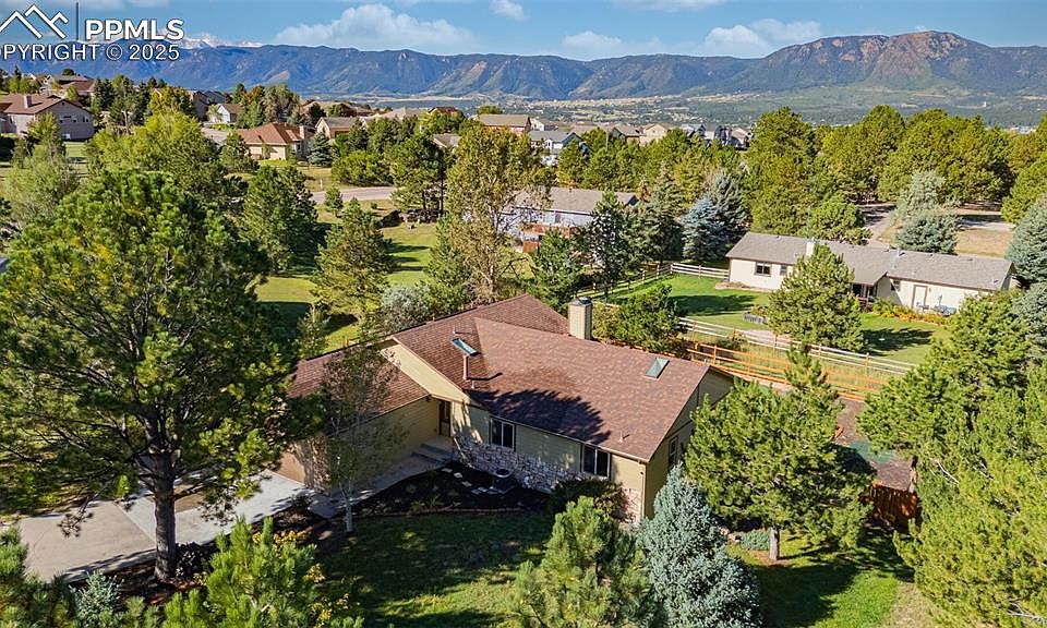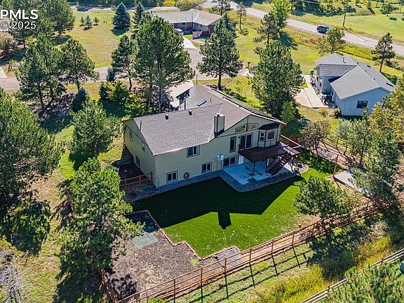 Welcome to a beautifully updated home tucked away at the end of a quiet cul-de-sac in Monument. Situated on nearly half an acre, this property offers the perfect blend of space, privacy, and convenience—just minutes from I-25, Highway 83, shopping, dining, and with an easy straight shot to Parker. Inside, you’ll find five bedrooms plus a dedicated office, two living rooms, and three fully renovated bathrooms. The primary suite is conveniently located on the main level and boasts a walk-in closet and attached bathroom, creating a private retreat. The heart of the home is the fully remodeled kitchen, featuring all-new cabinets, granite countertops, custom tile, and new luxury vinyl plank flooring. Fresh interior paint and thoughtful updates throughout make this home move-in ready. Enjoy cozy evenings with a fireplace on both levels, and entertain with ease in the finished basement that includes a wet bar. Practical upgrades include paid-off solar panels with a backup battery system, giving you efficiency and peace of mind year-round. Step outside to a backyard designed for both relaxation and entertaining, complete with a private deck, low-maintenance astroturf, and charming string lights—all surrounded by a peaceful setting at the end of the cul-de-sac. Don’t miss the opportunity to own this Monument gem with a main-level primary suite, multiple fireplaces, a basement wet bar, energy-smart features, and a location that can’t be beat!
