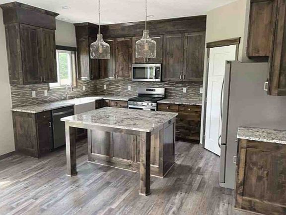 The kitchen is a chef's delight: granite countertops, a center island with seating, stainless steel appliances, and plenty of storage and prep space.