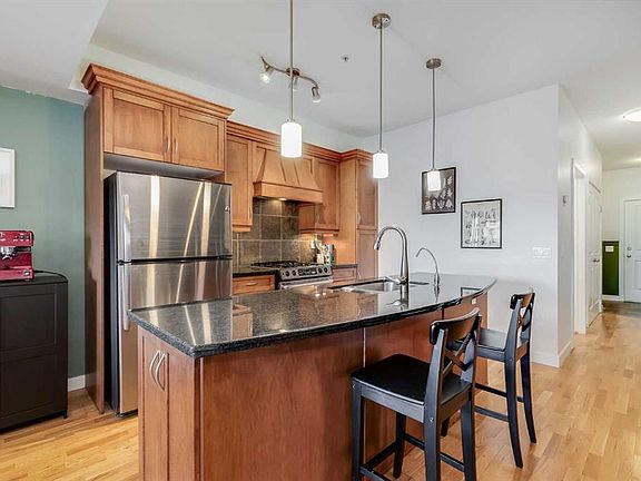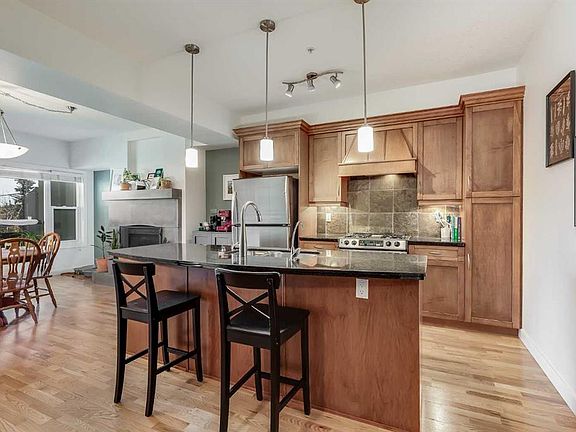High ceilingsGranite countertopsTimeless shaker cabinetsStainless steel appliancesGas stoveSit up islandBeautiful fireplace