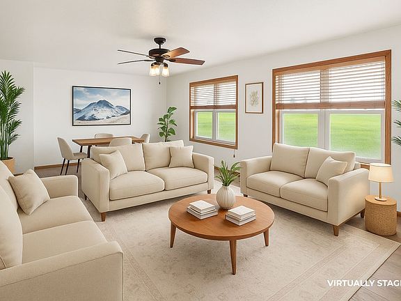 This tree-lined 4-bedroom, 3-bath walkout ranch rests on 2 peaceful acres, offering the perfect blend of space, comfort, and country charm. Built in 2010 and meticulously maintained, it features 1,680 sq ft on the main level plus a fully finished walkout basement for a total of 3,260 sq ft—ideal for everyday living and entertaining. The upper level includes three large bedrooms, while the lower level offers an additional bedroom plus a bathroom and office, making it perfect for guests or a private workspace. The open-concept kitchen, dining, and living areas create a warm, welcoming vibe, with the dining room window framing beautiful sunsets. The lower level also includes a spacious family and rec room perfect for movie nights or game days.