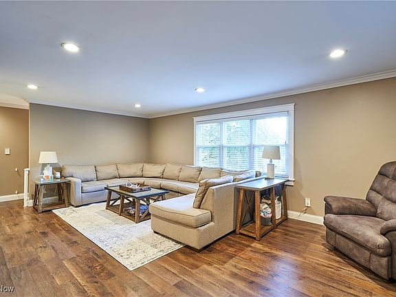 The spacious living room features newer LVT flooring, crown molding, upscale trim, and recessed lighting—creating a bright, open-concept layout that flows seamlessly into the dining area. The adjoining formal dining room also showcases updated flooring, trim, and lighting, with easy access to the deck and backyard.