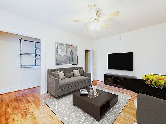 This charming studio apartment for rent features a galley kitchen and a spacious layout with hardwood floors and a ceiling fan. The apartment offers plenty of room for a small dinette set or a home office.