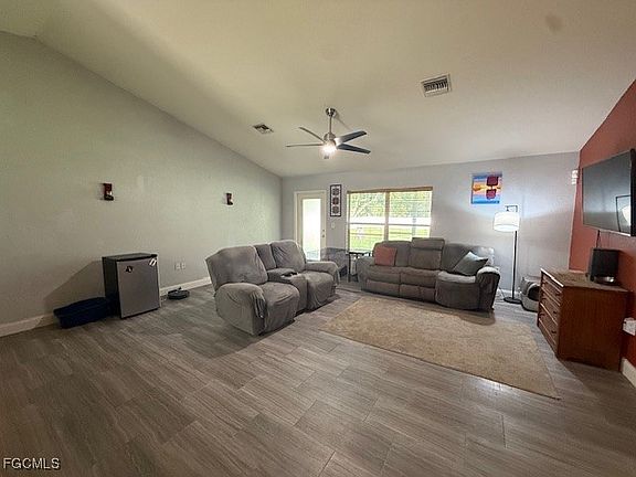 Welcome to 1818 Robert Ave! Located in a desirable area of Lehigh Acres, this beautifully maintained home offers 3 bedrooms plus a versatile den, which can easily be used as a fourth bedroom or home office. The spacious kitchen features an island and all appliances included. Adjacent to the kitchen, you'll find a dedicated utility and pantry with a washer and dryer included. The open concept living area boasts vaulted ceilings and a plant ledge for added character. The laminate wood look floors add warmth and durability, while the neutral gray paint throughout provides a modern and fresh feel. The main suite is generously sized with two walk in closets, double vanities, a garden tub and a separate shower. The two additional bedrooms and the extra den provide plenty of flexibility for all of your needs. The large fenced backyard is ideal for pets, kids, or outdoor entertaining. The two car garage and extended driveway offers plenty of storage space and parking. Additional features include new carpet, hurricane shutters, and HVAC system only 5 years old. The is one you don't want to miss out on.