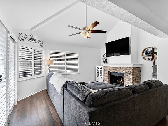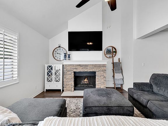 The kitchen has been thoughtfully updated with sleek quartz countertops and stainless steel appliances, perfect for both everyday meals and entertaining. Relax in the inviting living room, featuring a charming stone wood-burning fireplace, or step outside to one of two private balconies to enjoy the California weather. The master suite is a true retreat, complete with a vaulted ceiling, ample closet space, and a luxurious en-suite bathroom with granite accents.Additional highlights include a convenient laundry area in the direct-access garage.