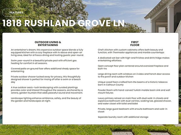 Stunning Custom Home with Heated Pool & Outdoor Kitchen in Rushland!Welcome to this exceptional custom-built home with heated pool and fully equipped outdoor kitchen, nestled in the sought-after community of Rushland on Johns Island. Thoughtfully designed and beautifully appointed, this residence offers the perfect blend of Lowcountry charm and modern luxury.Step inside to an inviting open floor plan featuring reclaimed hardwood floors throughout, shiplap accents, high ceilings, crown molding, and an abundance of natural light. The spacious living room is anchored by a gas fireplace, custom built-ins, a bar with beverage fridge, and has doors that lead to the expansive porch overlooking the pool and backyard oasis.A chef's dream kitchen awaits, complete with alarge center island with seating, farmhouse sink, gas range with custom hood, marble countertops, designer lighting, tiled backsplash, and a generous pantry. The adjacent dining area is flooded with natural light and also has french doors that open onto the porch and outdoor kitchen, perfect for indoor-outdoor entertaining. Outdoor living is truly spectacular, with a large porch featuring a outdoor kitchen, mounted television, and a wood-burning fireplace ideal for cozy fall evenings and marshmallow roasting. The heated pool is surrounded by lush, layered landscaping and a spacious covered patio, creating a private backyard oasis. The main-level primary suite is a serene retreat, with vaulted ceiling accented by wood beams, plantation shutters, and dual walk-in closets with custom built-ins including a large, built-in safe. The luxurious primary bath features a soaking tub, marble-tiled glass shower, huge vanity with dual sinks and marble countertops, and a private water closet with both toilet and bidet. Another large bedroom suite is also located on the main level, perfect for guests, with generous walk-in closet and beautifully tiled bathroom. A spacious laundry room is conveniently located on the main floor, with an additional stacked washer and dryer upstairs. A stylish powder room featuring a marble sink and wall-mounted faucet completes the first floor. Upstairs, a versatile flex space is perfect for a kids' play area or teen lounge. Two generously sized bedrooms each feature their own stunning en suite baths with designer tile, marble vanities, and ample closet space. On the ground level, the side-entry 3+ car garage offers abundant space for vehicles, golf carts, recreational gear, and more including a custom-built home gym area. Built by Level Building Projects, this home has many custom features and upgrades - see list under documents. Rushland is a 500-acre waterfront community recognized as a designated wildlife sanctuary, offering residents serene natural beauty just 20 minutes from downtown Charleston and local beaches. Community amenities include a deepwater dock on the Stono River, neighborhood pool, grand pavilion, playground, and walking trails providing an unparalleled Lowcountry lifestyle.