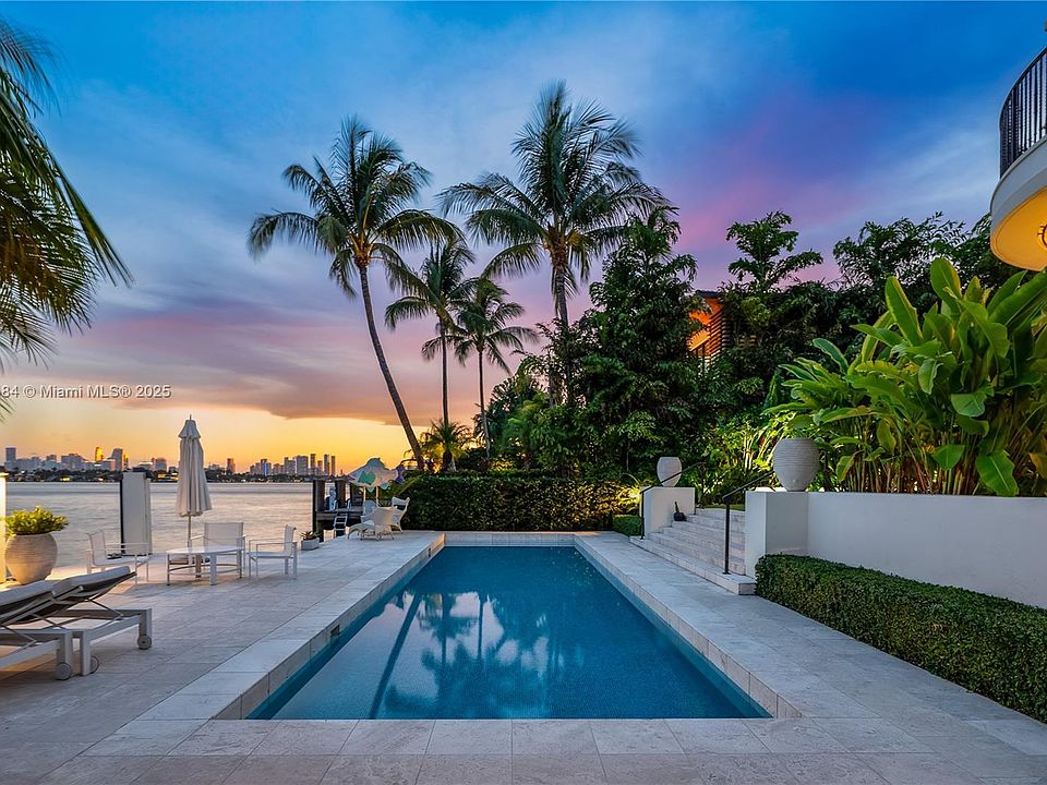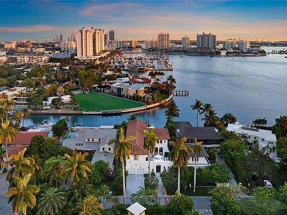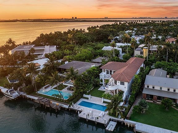 Located on the prestigious Sunset Island III, this exquisite 6-bed, 5.5-bath Spanish-style home blends timeless elegance with modern comfort. Soaring 12’ ceilings, French limestone floors, and a coral stone courtyard set the tone for refined indoor-outdoor living. The kitchen features a Calacatta marble island, Wolf appliances, gas stove, and dining area—seamlessly flowing into the family room with captivating water views. Upstairs, enjoy 10’ ceilings, Brazilian cherry wood floors, & a primary suite with dual walk-in closets & a private terrace overlooking Biscayne Bay and the Miami skyline. A detached guest house offers privacy and flexibility. Your backyard escape awaits with a heated saltwater pool, outdoor shower, and private dock offering direct access to the bay.