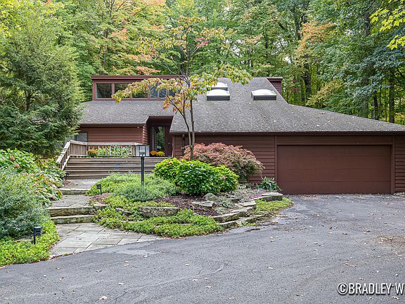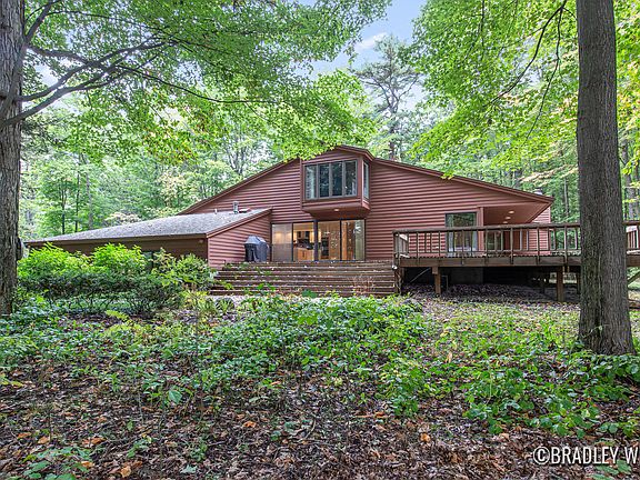 From the moment you arrive, this Spring Lake retreat feels like a private escape surrounded by 7.3 acres of peaceful woods and timeless design. Step inside the architect-designed home where soaring vaulted ceilings and walls of windows fill every corner with natural light and frame views of the trees beyond. The open layout flows effortlessly from the welcoming foyer into spacious living and dining areas, perfect for relaxed evenings or casual entertaining. The kitchen invites conversation with its generous layout and built-ins, including a wet bar with hidden storage for a clean, modern feel. Each of the three en-suite bedrooms offers its own sense of comfort and privacy, while a playful loft adds space for creativity or quiet retreat. Step outside onto the wraparound decks and listen to the breeze move through the trees, or take a short walk to your deeded lake access with a private boat dock on Spring Lake. Rarely does a home combine this level of serenity, style, and location... close to bike paths, golfing, local shopping and much more. Schedule your private showing today before this one-of-a-kind property slips away.
