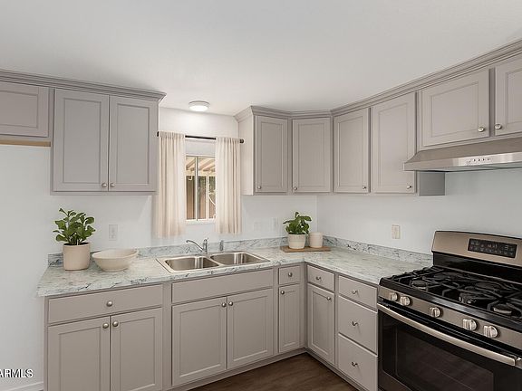 Seize the chance to own this freshly updated 2-bedroom, 2-bath mobile home! You're welcomed by an inviting front patio perfect for enjoying morning coffee. Inside, you'll find an appealing open layout with a soothing palette and stylish wood-look flooring for a timeless appeal. The kitchen comes with pristine cabinetry with crown moulding, and sleek stainless steel appliances for an enjoyable cooking experience. Both main bedrooms feature soft carpeting, ample closet space, and a private bathroom for added comfort. Outside, the backyard offers a fantastic opportunity for crafting your dream oasis. Don't miss out on this one!
