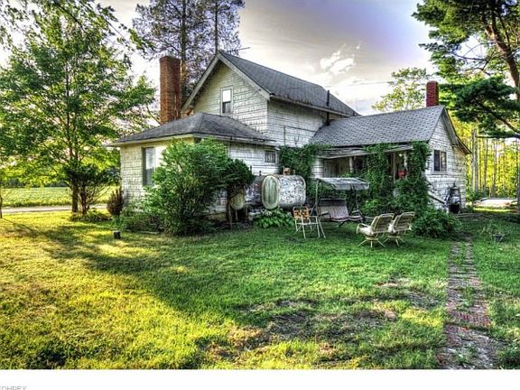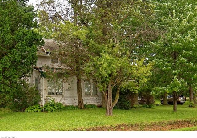Do you like the feel of living in the country? Try this 1825 fixer-upper needs repair/replacement/updating ** Approximately 2.6 wooded acres. Rectangular lot, in a single parcel number, with a 60'-wide railroad track bisecting the back portion (see photos). Back portion, we're told, is accessible on foot under the railway bridge over a small drainage creek. Possibly accessible from a north private plowed parcel that has a farm tractor trail connecting a second plowed parcel adjoining the back of this parcel (see photos) ** Two or three trains a day? ** City water (unused cistern and well). Old leach bed septic system. Newer oil-fired forced air furnace & ducts. Older propane-fired water heater, kitchen range and clothes dryer (yep) ** Home was lived in until Jan. 2014. Now occupied on part time basis. Two bedrooms (both up), living room with wood burning fireplace, dining room, and kitchen with full bath ** Enclosed front porch in bad shape ** Basement with concrete floor. Walls segments are a mixture of large stones in concrete, Terra Cotta hollow tile and masonry block. Basement is entered from a sagging open back porch ** Large detached garage in poor condition ** Small, collapsed, wooden barn behind the garage. Watch for poison ivy. Couple of old lawn mowers in sight. Home of a large buzzard. Under a large, dead tree. Would suggest not entering ** Purchase for the land's tax value? Restrictions on the use of the land. Worth a L@@K
