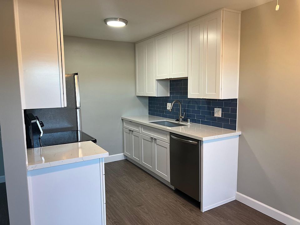 This 2 bed 1 bath unit features luxury vinyl plank flooring throughout, custom quartz counter tops accompanied by a under-mount stainless steel sink, new cabinets, custom backsplash, and all stainless steel appliances. The bathroom includes tiled enclosure, large chrome shower head, upgraded ceiling fans and fixtures. Unit also features 1 garage parking space. Recently renovated, shared laundry room on-site an a roof top deck. Located near shopping centers, minutes from the beach and El Segundo business communities such as the PCT Towers, Boeing, and Northrop Grumman. No pets. Please call Riviera Management for viewing instructions. Owner pays for water & trash