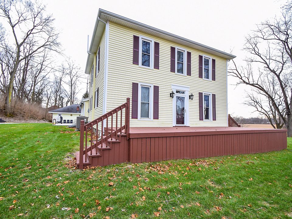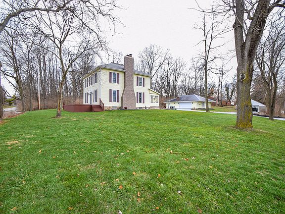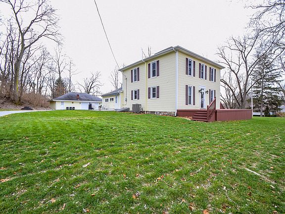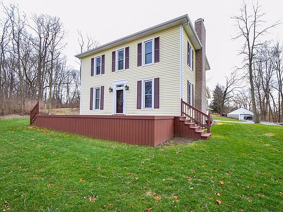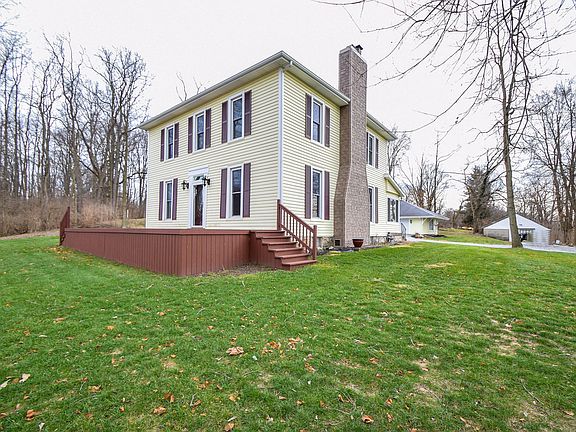 Beautifully renovated with high-end finishes , walls moved to create spacious modern living with a brand new feel throughout. Huge great rm w/woodburning fireplace that has stone surround & gorgeous hardwood flooring that continues into dining room, kitchen w/ ceramic flooring & backsplash, stainless appliances that remain, granite counters and beautiful maple cabinetry. Also on main floor is full bath with laundry area & two enclosed porches for many possible uses. Upstairs has 3 large bedrooms & another full bath with tiled shower, double sinks & storage. Detached 2 car garage has work shop, half bath, and another laundry area with washer & dryer that remain in addition to another 1 car garage, half circle drive, over 2.5 acres w/ woods & fire pit area. Updates include all electric, plumbing, tankless water heater, siding, roof, HVAC, windows, doors, baths, flooring, drywall, insulation, lighting, kitchen, chimney & and more. No details were overlooked on this pure quality restoration!