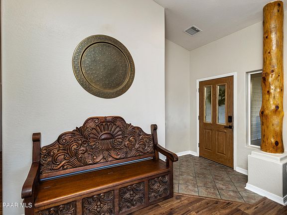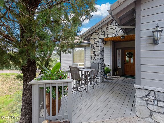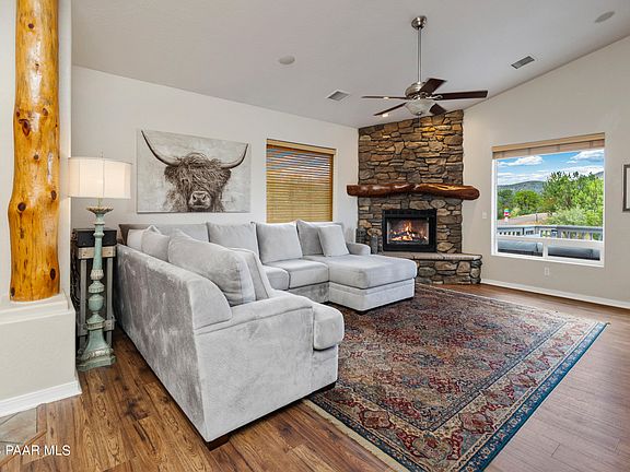 Nestled in the highly coveted Kingswood community, this home boasts the epitome of pride in ownership. Meticulously cared-for, this home greets you with exceptional curb appeal, framed by majestic ponderosa pines and elegant stacked stone accents. From the entry and living room, you'll savor magnificent views, including the impressive Granite Mountain and the picturesque surrounding mountain ranges. Hiking trails into Prescott National forest are out minutes away. As you step inside, the main level unveils an open great room concept. Here, a striking floor-to-ceiling stacked stone gas fireplace takes center stage, complemented by a one-of-a-kind gorgeous wood mantle. Vaulted ceilings enhance the sense of light and airiness, while an abundance of natural light pours in through a wall of