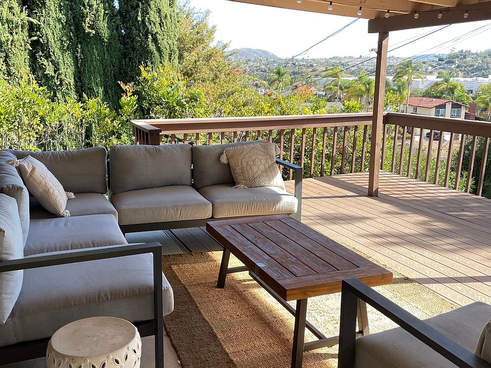 Private family home tucked away in the hills of Vista with beautiful views, ocean breezes and privacy. Close to freeways, schools, shopping and public transportation. Relax or entertain on your expansive covered Trex deck patio. The backyard is filled with established Meyer Lemon, Orange, Grapefruit and Avocado trees! There's also a raised garden bed to grow your own flowers, vegetables or herbs. Large living room features a charming wood burning fireplace and large windows. The kitchen has beautiful wood cabinetry, tons of counter space, and ample storage. The house was just painted and features vinyl wood flooring throughout entire home. There are 3 sizable bedrooms plus large indoor laundry room with huge storage closet that can be used as an office. The oversized two car garage is equipped with workbench and French doors that lets in natural light. Electric bill paid by owner. Tenant is responsible for rest of utilities. Washer, dryer, dishwasher and refrigerator included. A well behaved dog may be considered with pet deposit. One rental application is required for each adult Ready for move-in on January 15th. Please do not disturb current tenants. One year lease. Parking on long shared driveway not allowed. Owner pays for electricity. Renter is responsible for water and gas. First month's rent and security deposit due at signing. No smoking allowed. Dog will be considered with pet deposit.