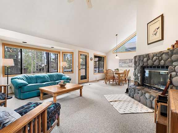 Welcome to 4 Oregon Loop! This charming Sunriver home sits among the soaring pines, offering a peaceful retreat minutes from all the action the resort has to offer. With vaulted ceilings, a river rock fireplace and ample windows overlooking the large lot backing to common space, this lovingly cared for home is offered turnkey, ready to enjoy. The ground-level main floor boasts an open floorplan with kitchen, dining, living, laundry, 2 guest bedrooms and a guest bath. Head upstairs to the private primary bedroom with it's own balcony, two closets, and en suite bath with dual vanity and walk in shower. Call your favorite broker and schedule a private tour today!