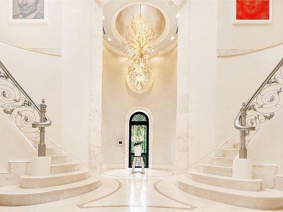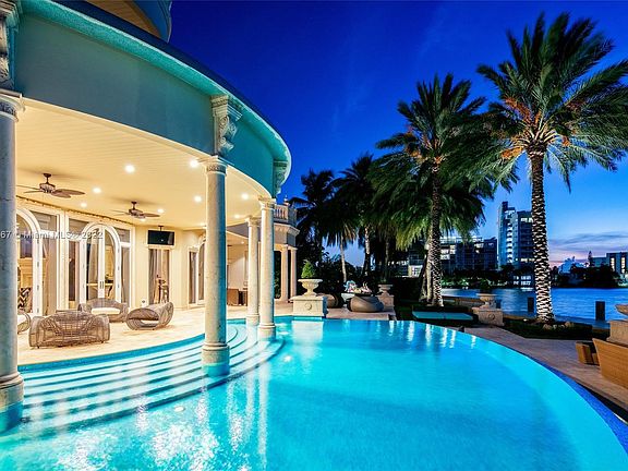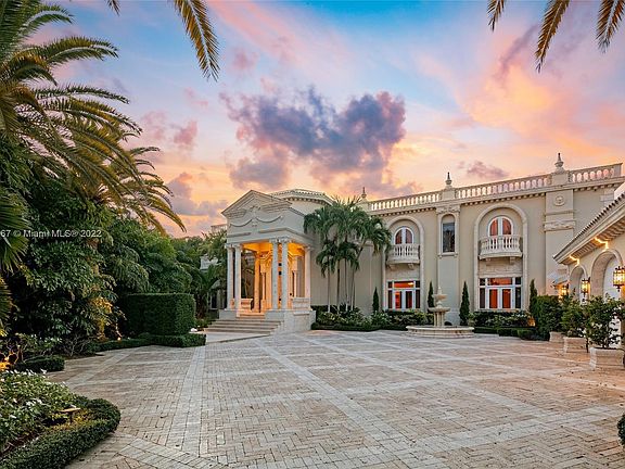 Absolutely unparalleled in finishes, appointments & furniture, this 12,879 SF palatial estate is designed like no other. Villa Magnolia sits upon 221 ft of wide waterfront with nw exposure, offering a front-row seat to dazzling sunsets. Private gates open to reveal a majestic Neoclassical home towering above verdant foliage. Enter into a rotunda foyer w/ a soaring 40-foot ceiling, curved marble & a striking two-sided staircase w/ white gold leaf bannisters. Unique features include hand-crafted stone throughout, European paint finishes, 15-foot coffered ceilings, 2-infinity edge pools, one just off the principal suite, 3rd level rooftop entertaining terrace, temperature-controlled 850-bottle wine room, gourmet kitchen w/ a built-in 750-gallon aquarium, movie theatre & glass elevator.
