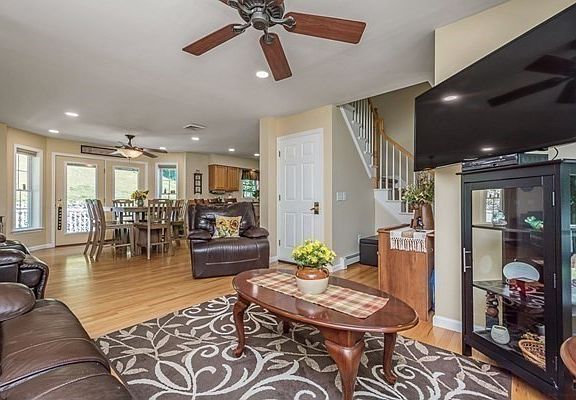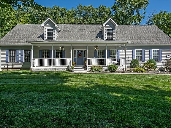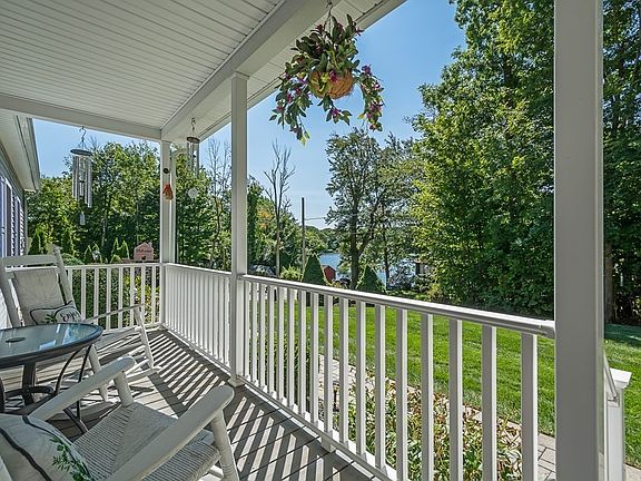 This beautiful cape is located on nearly 2 acres of private land across the street from Waite Pond. Enter through the relaxing front farmers porch to an open concept floor plan with great ceiling height and abundant natural light in the living room. The kitchen has a delightful breakfast bar with lots of countertop and cabinet space. The dining area includes a pellet stove for a centralized alternative heat source. The first floor master suite off the living room has a private full bath and large walk-in closet. The first floor also includes a half bath/laundry room, and an office that could also be a 4th bedroom. The second floor contains two large bedrooms and another full bathroom. Above the garage is an ideal game room or large heated storage area. Fresh paint and newer recessed lighting throughout! Exterior features are an oversized shed, rear deck and patio, long paved driveway, an irrigation system and more!