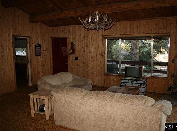 This rustic mountain Tahoe home with open lodge pole pine beams, real pine paneling and expansive windows features four bedrooms, 3 baths, with a large family/game room. The corner lot runs the length of the block and has an additional garage accessed underneath the house, along with RV parking. Makes for an excellent rental opportunity with it's authentic mountain feel, size, and location, but functions beautifully for a family with the family r oom on separate level from the main living level.