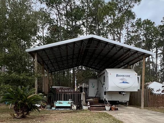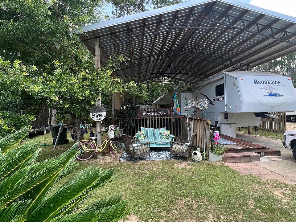 Coastal RV Lot. Why pay rent for your RV? This lot is a jewel in the highly desirable Land Harbor section of Spanish Cove on a quiet street next to an open lot that gives added privacy and space. The property has a long concrete pad for an RV, an RV cover (28'x36'), a large deck, and a cottage style shed (8'x16') that includes: a bath, washer and dryer and a daybed. The large attic gives you an abundance of extra storage. This property is in the safe, friendly, beach neighborhood on the shores of Perdido Bay just 5 minutes from the Lillian boat launch and only 15 minutes from the sugar white beaches of the Gulf of Mexico. Owners enjoy membership with a lifestyle full of amenities and low POA Dues of only $74/mo (includes trash pick-up). There is something for everyone: two clubhouses to host events and club meetings; year-round junior Olympic sized swimming pool with aquatic classes; tennis courts (tennis club) pickleball courts; basketball court, fitness facility, playground, public shower area, shuffleboard court, and nature trails. You can join the community-organized activities like Bingo, card and game nights, book clubs, garden club, and enjoy group travel opportunities. If you like to relax, you can spend the day at the Spanish Cove beach area or fishing from the 500-ft pier enjoying the famous Alabama sunsets, check out the neighborhood lending library with puzzles and movies, public showers and a laundry facility is on site for your convenience. Enjoy a glass of sweet tea on the large patio or watch the sunset while taking a stroll around this lovely golf cart community. Come see your new home or weekend getaway.