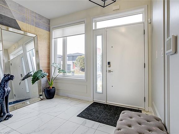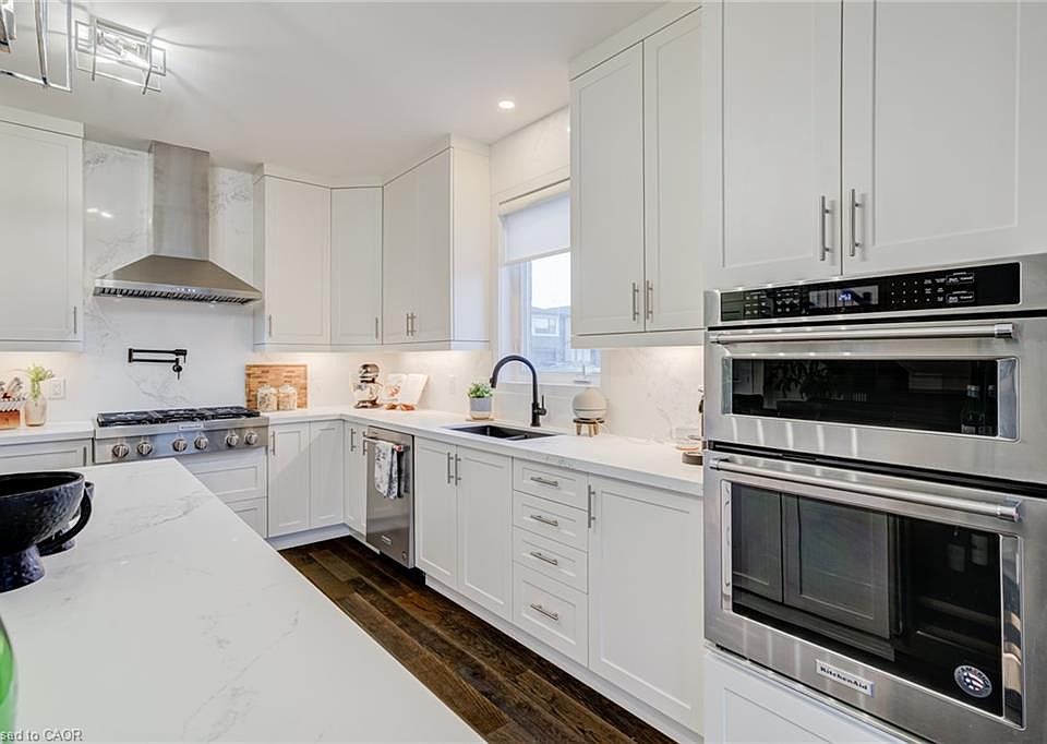 Beautifully upgraded 4-bed, 3-bath home in Ancaster’s sought-after Meadowlands! This executive residence features 10-ft ceilings, hardwood floors throughout, oak stairs, custom millwork, wallpaper accents, and stylish upgraded light fixtures throughout. The designer kitchen boasts quartz countertops, extended pantry cabinetry, pot filler, wine fridge, and built-in KitchenAid appliances including a 6-burner gas stove. Relax in the open-concept living room with a gas fireplace and electric blinds. Upstairs, enjoy a luxurious primary suite with spa-like ensuite featuring quartz counters, upgraded tiles, and a freestanding soaker tub. Includes home surveillance system, custom blinds, and a double garage. Located near Ancaster High School, big box stores, scenic trails, and waterfalls.