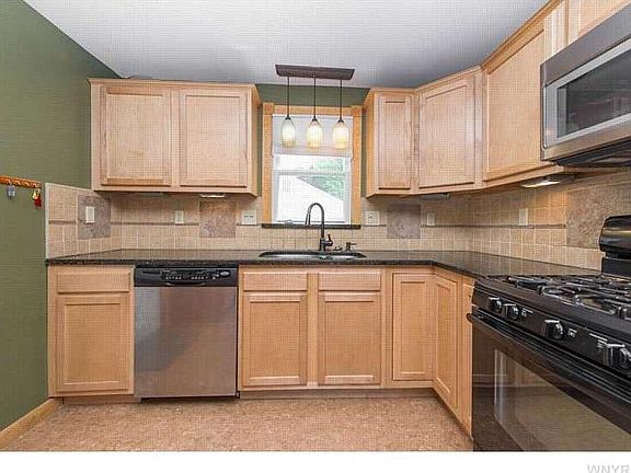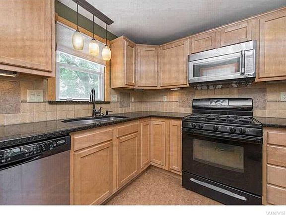 Bring the boxes, move in ready home in the heart of Blasdell. Meticulously cared for 3 bedroom, 2 full bath home. Updates include central air 2014. Kitchen includes appliances, granite counter tops, tile backsplash and gorgeous cabinets. Vinyl windows throughout. Finished basement extends your living space with full bath downstairs with tile shower and tankless hot water tank. 2 car garage with electric and generator hookups, fully fenced yard. Steps beyond your backyard is JFK Park. Hardwood floors in first floor bedroom and living room. Walking distance to most conveniences.