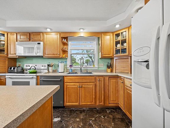 This home is a split entry, located in a friendly, well established neighborhood. The 1st fl features a comfortable living room with a fireplace and large bay window, spacious kitchen with an island and lots of storage, and a separate dining room just off the kitchen. Connected to the dining room is a 4-season porch which brings in abundant natural light. Use this space to entertain, read a book, or simply relax and watch the birds. Access the deck through the porch and bring your dining experience outdoors! 2 bedrooms and a full bath are also on the 1st floor. Downstairs there is a large laundry area, and two more bedrooms. One bedroom has an oversized 1/2 bathroom which could easily be converted into a full bath. This bedroom also has a unique bonus room around a curved wall which could be used as a nursery, reading nook, or small office. So many options! The backyard has plenty of space to relax and play. Don't miss your chance to check it out! Schedule a private showing today.