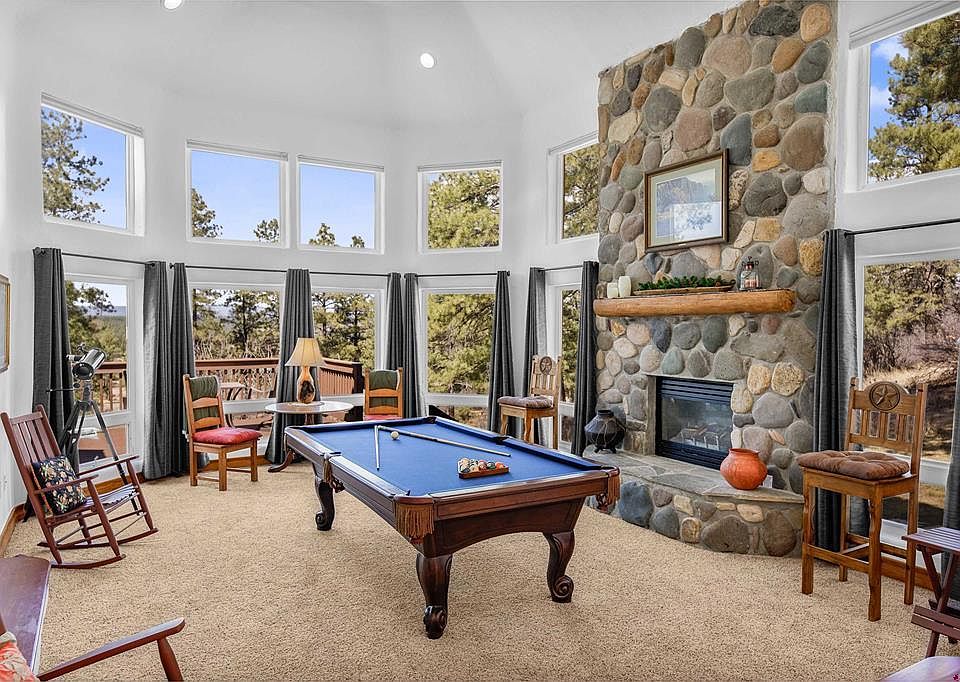 Come and see this amazing home that sits on 8.74 acres at the end of a wooded cul-de-sac, just 3 miles south of town. The seller has invested over $200,000 in essential upgrades, making this home move-in ready. The oversized 2-car garage offers plenty of room for all your Winter toys, space for a work bench or any other projects you may have. The spacious living room is large enough for a lovely pool table and perfect for family entertainment. The large windows let in all the natural light you need. The kitchen is equally spacious, featuring new granite countertops, new stainless steel, dishwasher, microwave, range-top, wall oven, sink and warming drawer for large events. Even an eat in kitchen with a separate formal dining room area making it ideal for holiday gatherings. Perfect set up for a VRBO, with 4 bedrooms and 2.75 bathrooms, game-room/movie theater for the kids all tucked away in a private wooded setting and yet convenient to town. Additionally, the home boasts a new roof, remodeled bathrooms, and new Trex decking surrounding the house. Even peek a boo mountain views while enjoying the best Sunsets from the front deck. The sellers recently installed a new boiler with six zones, 1 line dedicated for hot water with new tank for the in-floor heating system, which will warm your toes on those cold evenings. The primary suite bathroom has been completely remodeled and now features a luxurious garden tub and a separate walk-in shower, new cabinets and countertops. The two additional bedrooms share a completely remodeled bathroom with window bench storage for those extra blankets and pillows when family or guest are visiting. Furthermore, the interior has been professionally painted throughout. Outside you can enjoy sitting around the cozy firepit on a starry night while roasting marshmallows with the kids, creating those memories to last a life time. All the work has been done so just bring your suitcases and start living the Pagosa Dream!