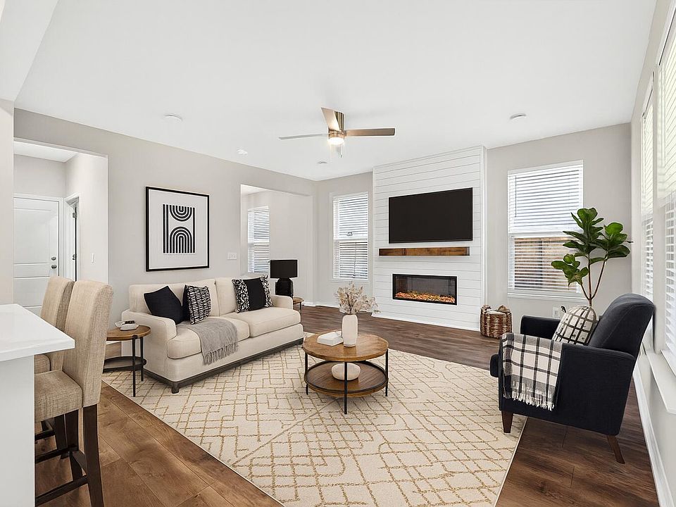 Welcome to this beautifully upgraded Maple floorplan, thoughtfully designed for both style and everyday functionality. Step into an inviting foyer with laminate flooring that extends throughout the main living areas. The kitchen serves as the centerpiece of the home, offering 42'' white cabinetry, a striking admiral blue island, quartz countertops, tile backsplash, pre-wired pendant lighting, a spacious walk-in pantry, and a smart refrigerator. The great room features an electric fireplace with a shiplap accent wall, creating a warm and welcoming gathering space. Convenience shines with a main-level laundry room enhanced with tile flooring. Oak tread stairs lead to the second level, whereyou'll find a versatile loft, all bedrooms, and a shared full bath with quartz vanity and tile flooring. The primary suite showcases a tray ceiling, while the spa-inspired ensuite includes a soaking tub, separate frameless shower, and dual quartz vanities. Additional upgrades include ceiling fans in every room, custom blinds, a MyQ garage door opener with remote access, and a security camera system. Enjoy year-round outdoor living on the screened porch overlooking a large fenced backyard with a wooded buffer for added privacy. This home also offers lawn irrigation, a HERS score of 48, and Energy Star Certification with Energy Series PLUS efficiency. Located in the sought-after Jasmine Point section of Cane Bay, residents enjoy resort-style amenities including a community pool, cabana, wooded play park, and miles of sidewalks. Cane Bay Plantation also offers miles of biking, walking, and golf cart trails, complete with underground tunnels, connecting you to local schools, shopping, dining, and the largest YMCA on the East Coast. The community's 300-acre lake system provides endless opportunities for recreation. Conveniently situated near Black Tom Road and Fairwinds Boulevard for easy commuting, this home presents an exceptional opportunity to experience the Cane Bay lifestyle. Motivated sellers priced to move.