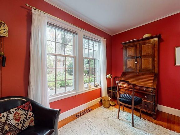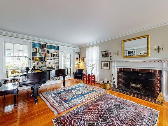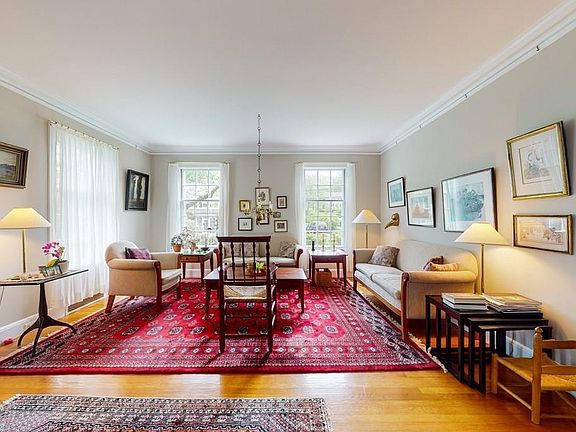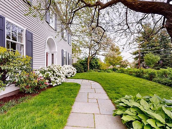 Modeled on c. 1800 NH Federal residence. Tree-lined street 1 mi. to Belmont Town Ctr. Set behind low-rise granite wall & mature gardens by Michael van Valkenburgh. 5-bdrm, 3.5-bth, 2 studies. Hardwood floors, generous reception rooms. Large living room: wood-burning fireplace, bookshelves, 3 exposures. Private study with bookshelves and storage. Expansive dining room with big bay window. Eat-in kitchen with access to outdoor dining and garden. Half-bath. Living room opens to stone-paved covered porch, beautiful rear garden. 5 good-size bedrooms, 2nd study, 3 full baths. Huge attic, possibly developable. Many flowering perennials. Generous laundry room. Wine closet, very large storage spaces. Residence has capped gas line. Circuit breakers. Newer roof. Most of exterior replaced several years ago with cedar clapboard. 2-car garage: automatic doors; 4 additional off-st spaces. Picket fence encloses 2nd outdoor dining area. Rare & delightful offering.