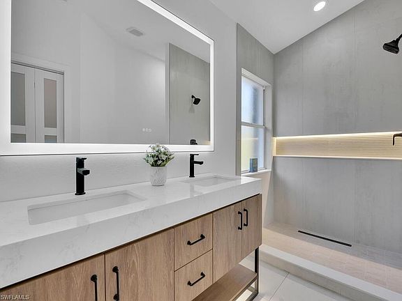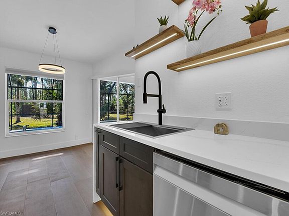 $20,000 price reduction on this beautifully updated single family home on 2.73 acres of 100% UPLANDS in growing area of Golden Gate Estates. This home has been tastefully renovated with many modern features. The home has a new roof in 2024, new appliances, new cabinets, new wide plank "wood look" porcelain tile, new fans and lights, and new landscaping. Other features of the home include: whole house Reverse Osmosis system, Accordion Hurricane Shutters, custom wood slate wall, and heated custom screened pool and spa.