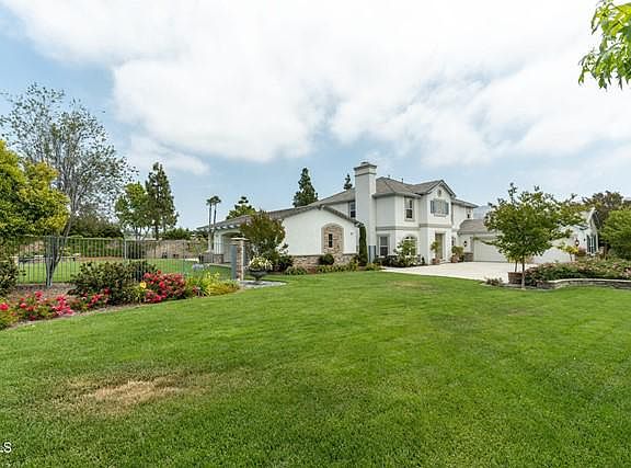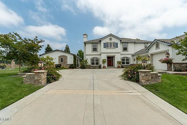 WOW!! Price Reduced! First time on the market for this beautiful home in highly desirable Camarillo Bella Rosa Estates! Spacious 5 bedroom + 4.5 baths gorgeous home built in 2000 within approx 3,834 sqft living area on over 1/2 acre flat lot! Terrific entertainer's home inside and outside! Includes beautiful 740 sqft pool house with wood tongue-and-grove ceiling, exposed beams, kitchen and full bathroom featuring marble surfaces. Entrance in house with high ceilings, decorative artwork and travertine flooring. Living room and attached dining room features engineered wood floor, fireplace and french glass doors leading out to the expansive outdoor entertainment area. Kitchen features an island, granite countertops and backsplash, stainless steel appliances, wine refrigerator, informal dining area and opening to family room. Large family room includes built-in cabinetry, travertine flooring and matching french glass doors. The spacious master bedroom features attractive fireplace. Master bathroom includes jet tub, dual basin sinks and a very large walk-in closet. Bedrooms are spacious and includes a 1st floor bedroom with en suite. House painted inside and outside in 2022 and new carpet installed! Beautiful landscaping throughout including lush lawns and fruit trees. Don't miss out on this terrific opportunity!