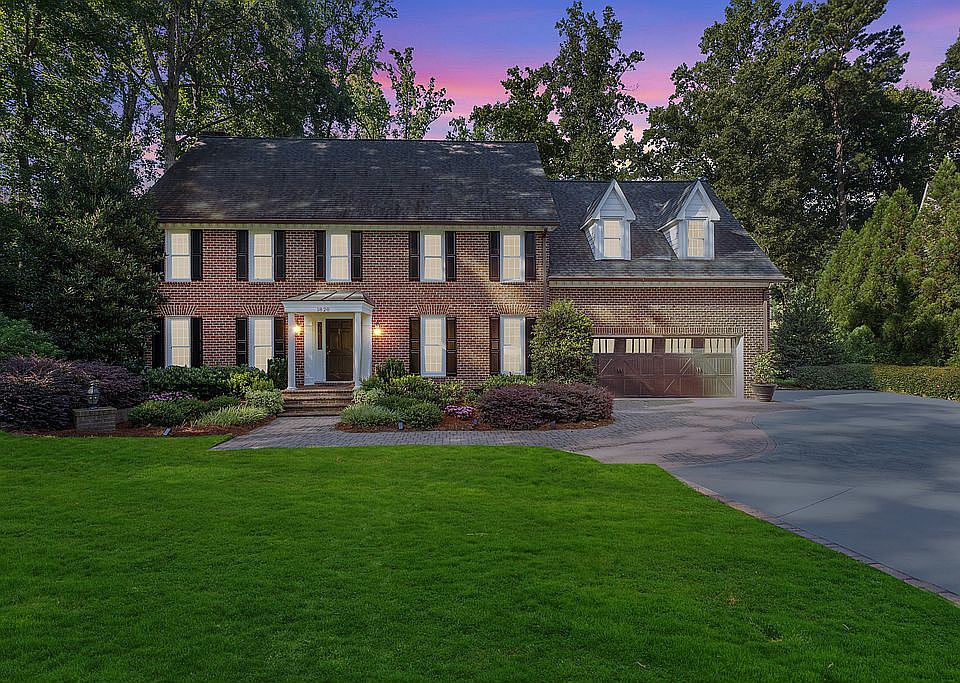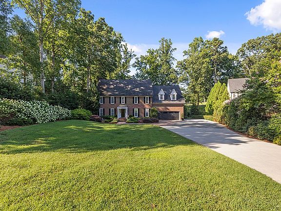 This custom, traditional home is designed to enjoy the natural beauty of one of the most beautiful lots in Raleigh. It has expansive views of the 13th green of the Oaks Course of North Ridge Country Club, a pond with a fountain, and an azalea garden. Architectural upgrades include an award-winning primary suite addition on the main floor, upgraded kitchen with cherry cabinets, cherry paneled home office/library with built-in desk and floor to ceiling wall of bookshelves, and site finished hardwood floors throughout with tile in bathrooms and laundry room. On the second floor are four large bedrooms and an massive bonus room complete with mini fridge and bar sink. The walk-up attic has three skylights, two windows, and is plumbed for a bathroom— perfect for adding additional living space!