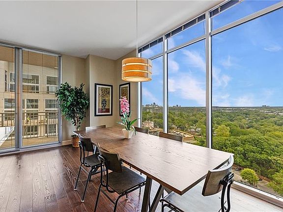 Welcome to The Brookwood, Atlanta’s only LEED-Certified condominium residence and one of the city’s most sought-after addresses, where luxury, sustainability, and convenience meet. This exceptional home offers a rare opportunity with three deeded parking spaces and a sprawling open floorplan designed for both comfort and style. Walls of floor-to-ceiling windows showcase sweeping views of the treetops and the glittering city skyline, filling the home with natural light and creating a striking backdrop to everyday living. From the moment you enter the gracious foyer, you are drawn into the expansive living space that flows effortlessly into the kitchen and dining areas. The chef’s kitchen is a showpiece, complete with Viking stainless steel appliances, including a gas-burning range, refrigerator, dishwasher, microwave, and vent hood, anchored by a dramatic oversized island that doubles as a breakfast bar and gathering space. The adjacent dining area captures treetop and skyline views, while the covered patio just beyond invites you to enjoy morning coffee or evening cocktails overlooking the vibrant city below. The private primary suite is a true retreat, featuring a custom walk-in closet, direct access to the balcony, and a spa-inspired bath with dual vanities, a frameless glass shower, and a soaking tub. Two additional bedrooms, each with its own en-suite bath, offer versatility for guests or a home office, all with sleek modern finishes that reflect The Brookwood’s signature style. Life at The Brookwood is defined by unmatched amenities and effortless convenience. Residents enjoy a 24-hour concierge, a junior Olympic-sized saline pool, three on-site restaurants, a state-of-the-art fitness center, beautifully landscaped green spaces, fireside outdoor living areas, grilling stations with a Green Egg, a dog park, wine storage, a catering kitchen, business and conference rooms, furnished guest suites, and attentive on-site management and maintenance staff. It is truly a complete lifestyle experience, blending luxury with community. Perfectly positioned with immediate access to I-75, I-85, Midtown, and Buckhead, and just moments from The Beltline, parks, shopping, and Atlanta’s best dining, The Brookwood offers a rare combination of urban vibrancy and private retreat. HOA dues include gas, internet, trash, sewer, pest control, reserve funds, and more, providing both peace of mind and exceptional value. With its LEED-Certified designation, world-class amenities, and unbeatable location, this residence is an oasis in the heart of the city.