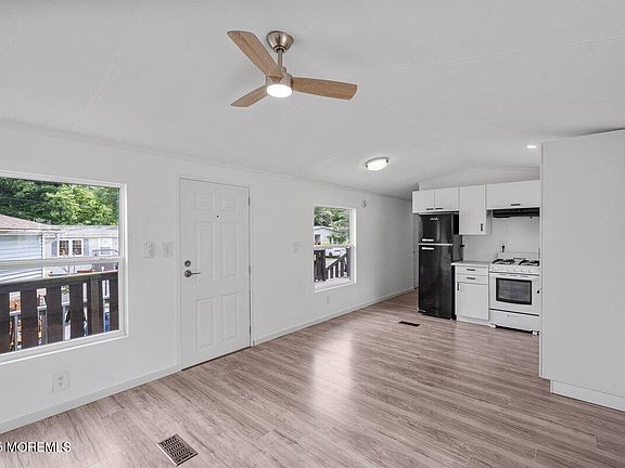 This home features a spacious open-concept layout with brand-new windows that fill the space with natural light, all new doors, new kitchen with new appliances, a newly renovated bathroom, new vinyl flooring throughout, new light fixtures, and ceiling fans. Outside, enjoy a fresh exterior with new skirting, a brand-new cedar deck, and a custom awning, perfect for relaxing after a beach day.