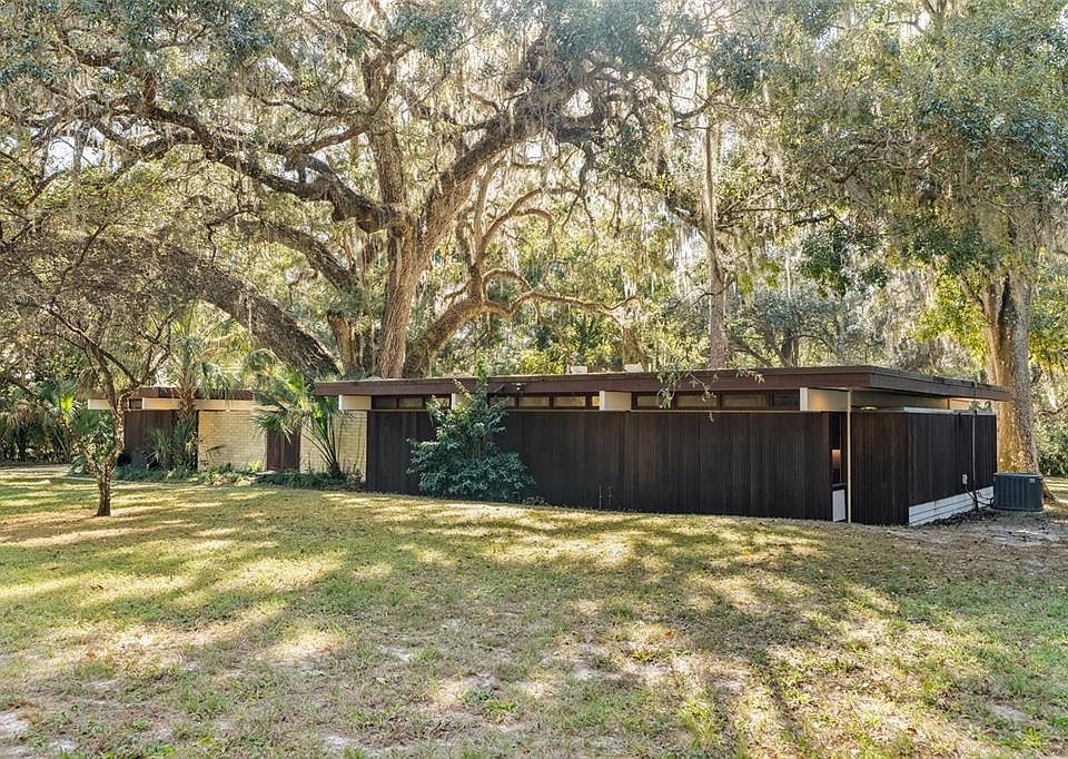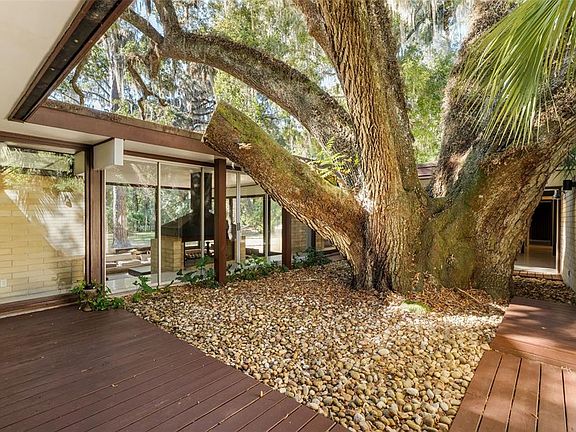 Welcome to the Haynes Residence—an iconic 1966 masterpiece by famed architect Harry Merritt, and arguably Gainesville’s most pristine example of true Mid-Century Modern architecture. Now, this extraordinary property can be yours. In the spirit of Frank Lloyd Wright, Merritt designed homes that didn’t simply sit within the landscape, but became part of it. Those sensibilities are on full display here: the exterior is wrapped in rich redwood siding, accented with Ocala block, and thoughtfully arranged around a breathtaking 350-year-old live oak. Walls of glass blur the lines between the nearly 2-acre sanctuary of a lot and the home’s interior, creating a seamless dialogue with nature from every room. Designed by a professor of architecture and meticulously restored over the past four years by the Director of the University of Florida’s School of Architecture, the home balances period authenticity with refined modern comfort. The kitchen is a warm, sophisticated showpiece featuring cabinetry crafted from the same wood used on the exterior, waterfall-edge countertops, designer geometric wallpaper, and an iconic Kelly Wearstler chandelier. A wall of sliding glass doors opens to an al-fresco dining space, reinforcing the home’s effortless indoor–outdoor living. The dining room is anchored by a George Nelson bubble chandelier and a custom built-in bar wrapped in bold Gucci tiger-face wallpaper. Just beyond, the dramatic sunken living room takes center stage. With its bespoke metal-hooded Ocala-block fireplace, custom conversation-pit coffee table and pendant lighting, and 360 degrees of windows framing views of untouched forest, this space feels both sculptural and serene—an unforgettable architectural experience. The private wing of the home offers a second, more intimate living room, two spacious guest bedrooms, a fully renovated guest bath, a laundry room, and a beautiful home office that connects directly to the primary suite. The primary bedroom features a striking redwood accent wall, clerestory windows, a vanity area, and a full-length closet that, like the guest bedroom closets, incorporates a California Closets system and original redwood Pella accordion doors. Through the completely renovated primary bath, the office connects back to the main courtyard and features built-in shelving, under-cabinet lighting, and another full wall of sliding glass doors. Extensive upgrades ensure the home is as functional as it is beautiful: a new commercial-grade roof, restored eaves, updated electrical and plumbing systems, fresh paint, and meticulously restored terrazzo floors result in a residence that feels renewed, refined, and ready for its next steward. The home also includes two septic systems and a well with a water purification system. The property itself is serene, low-maintenance, and profoundly connected to its natural setting. The towering tree canopy, filtered light, and the quiet movement of wildlife create an atmosphere of privacy and peace rarely found so close to the heart of Gainesville. The Haynes Residence is more than a home—it is a work of art, an architectural treasure, and a living testament to timeless Mid-Century Modern design.