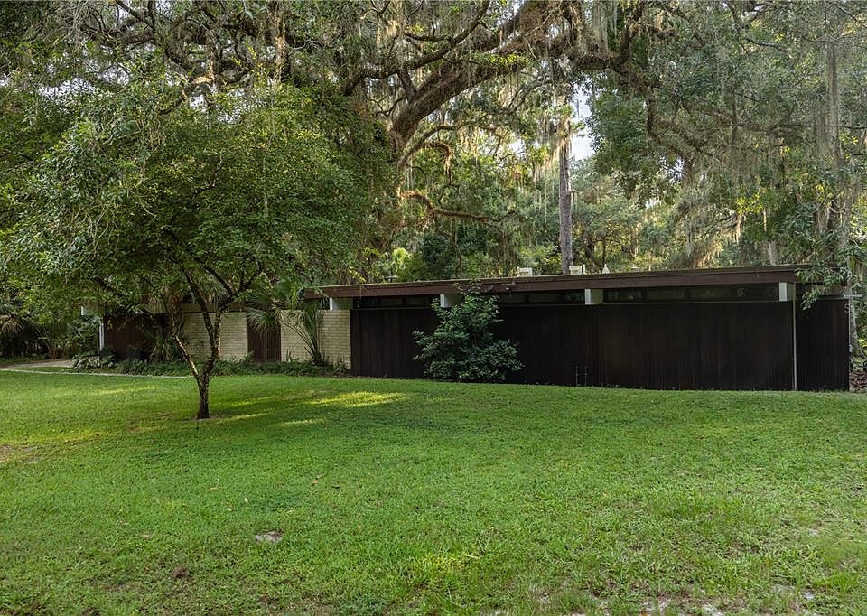 With its clean lines and harmonious integration with nature, the Haynes Residence is a Mid-Century Modern masterpiece. Designed by Architect Harry Merritt in 1966 and inspired by the Case Study Houses of Southern California and Frank Lloyd Wright’s Usonian Houses, this courtyard home embodies tranquility and architectural clarity with a palette of redwood siding, Ocala block walls, and terrazzo floors. Its expansive glass walls look out over a 1.65-acre property, which backs onto undisturbed forest just steps from Newnans Lake. This 3 bedroom plus office, 2 bathroom home respects its original design while breathing new life into its iconic elements with subtle sophistication. Extensive updates include a new commercial grade roof, repaired eaves, improvements to the plumbing and electrical systems, paint, wallpaper, and meticulously restored terrazzo floors. The home is centered on a 350-year-old Live Oak in the courtyard, which is visible from every living space through continuous glass walls. The courtyard’s deck and generous eaves create a dynamic outdoor living space that connects to the kitchen and dining rooms through a wall of sliding glass doors. The kitchen has been updated with stainless steel appliances, refinished wood cabinets, center island with breakfast bar and two pantries. Off the kitchen is the dining room with a George Nelson Bubble chandelier, recessed built-in buffet and large windows overlooking the expansive backyard. Around the corner is the dramatic sunken living room with wood burning fireplace and custom metal hood. This space features signature elements of Merritt's designs: its lofty height, Ocala block built-in seating and fireplace mantle, and walls of glass offering panoramic views. Around the corner is the more intimate family room with built-in seating (featuring hidden storage), windows to the backyard and another set of sliding glass doors to the courtyard. A hallway leads to an updated, full guest bathroom and two guest bedrooms with walls of windows overlooking the rear garden. At the end of the hall is the large primary suite. This room has a built-in vanity with a wall of shelves. All the bedrooms have custom closet systems by California Closets. The master bedroom has another Merritt signature feature, a wall of Redwood siding and clerestory windows. The Primary Suite includes an en suite bathroom with an updated shower with seamless glass enclosure, vanity with new sink. Both the primary bathroom and the family room connect to an intimate office with another wall of Redwood siding, built-in desk and flexible storage space. There are two septic systems and a well with a water purification system. The property is a serene, low maintenance space that embraces nature. The Live Oak–one of the largest recorded in the Southeastern United States, anchors the site, and its massive canopy shades the home. Deer pass quietly at dawn, owls nest in the limbs, and bald eagles soar overhead. Magnolia Estates is a peaceful sanctuary just three miles from downtown Gainesville and an easy drive to the University of Florida and UF Health. No HOA. The owners have undertaken a thoughtful and comprehensive restoration of this midcentury modern gem. Every detail has been approached with respect for the home’s original design, replacing and revitalizing what time had worn down. The result is a lovingly maintained home that honors its architectural legacy while enhancing its livability.