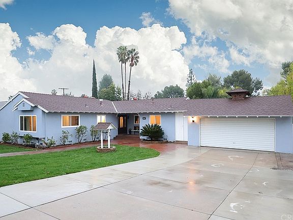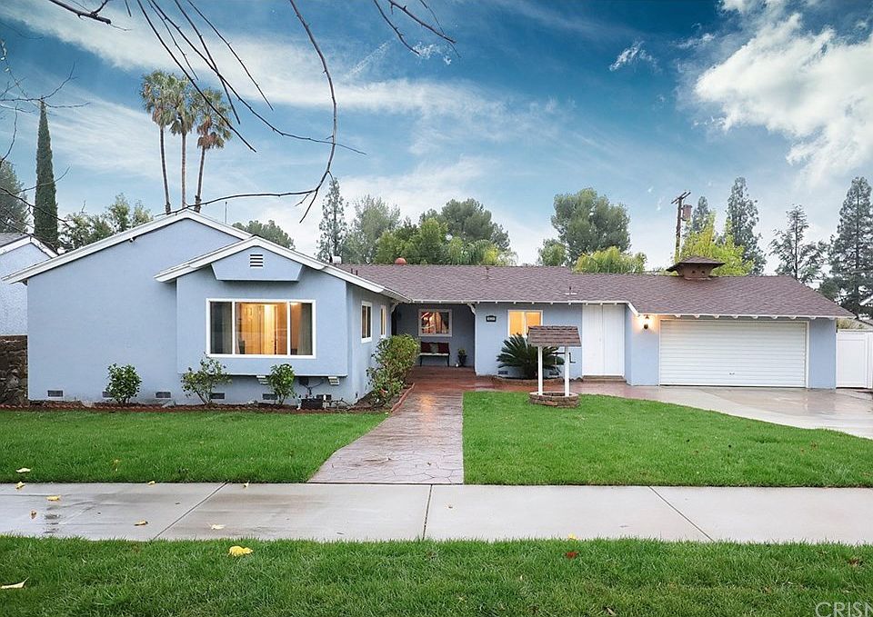 Beautiful Ranch style single-story in old Porter Ranch. Quaint and established, this home is spacious and filled with upgrades!! 4 security cameras surround this lovely 4 bedroom, 2 newly remodeled bathrooms with new shower, secondary bath has beautiful man-made stone counter, dual sinks in both master and hall baths, large tile floor, new front entry stamped concrete, new sod and sprinkler system in front, newer exterior paint, beautiful glass panel front door, remodeled kitchen with granite counters, dark cherry cabinets, pantry with pull out drawers, recessed lighting with drop lights over the counter, stainless steel appliances, backsplash up to cabinets and a pantry, living room crown moulding, laminate wood flooring, brick fireplace, separate laundry room, new carpet in bedroom, newly painted bedrooms, dual pane windows, large family room with bar leading outside to your oasis.....GORGEOUS completely redone backyard with no expense spared. Built in countertop bar with barbecue and outdoor sink, labyrinth fire pit with ample seating, vinyl topped fencing for extra privacy, removable security fence surrounds the sparking, dark bottomed pebbletec pool and spa with fountain and a breezeway from the front yard through to this amazing private entertainer's delight!! *** Square footage from Assessor includes bedroom/family room addition. Buyer to validate/confirm permit.***