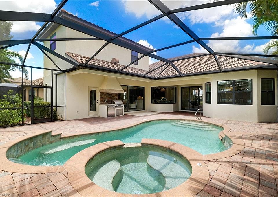 GOLF MEMBERSHIP INCLUDED. This "Toscana Grande" is perfectly located, offering easterly views of the main lake and 18th Hole, where you can enjoy a short walk to the clubhouse and amenities. The Toscana Grande is one of the largest homes that exists in Bonita National, perfect for large families, and this one is offered mostly FURNISHED. Boasting 3,301 sqft, 4 Bedrooms + Bonus Room Upstairs, 4 Full Bathrooms, 3 Car Garage, and Pool and Spa. The home offers a perfect blend of luxury, character, and comfort, with travertine flooring, custom wainscoting and mirrors, custom tray ceiling paneling, elegant light fixtures, a Kinetico Whole Home Water Purification System, "Photocatalytic" Air Purifiers on both HVAC Systems, and Impact Rated Windows and Doors. In the kitchen, the cooktop was replaced with a full-size range which is a chef's dream to have two ovens! An entire wall was removed to open the living space! Step outside to enjoy beautiful views of the golf course and main lake and effortlessly entertain with the built-in grill. BONUS: in flood-zone X so flood insurance is not mandatory. Bonita National has the best amenities in Southwest Florida highlighted by the resort-style pool with their showstopping rock waterfall and poolside bar and grill, championship-style golf with an over-sized practice facility and recently upgraded short game area, grand clubhouse with formal and informal dining, golf pro shop, card rooms, 8 Har-Tru lighted tennis courts, full service spa, and large fitness center. Pickleball and Bocce are coming soon to Bonita National! Located in the heart of SWFL, close to Bonita Beach, dining, shopping, RSW Airport, and the upcoming “Midtown at Bonita.”