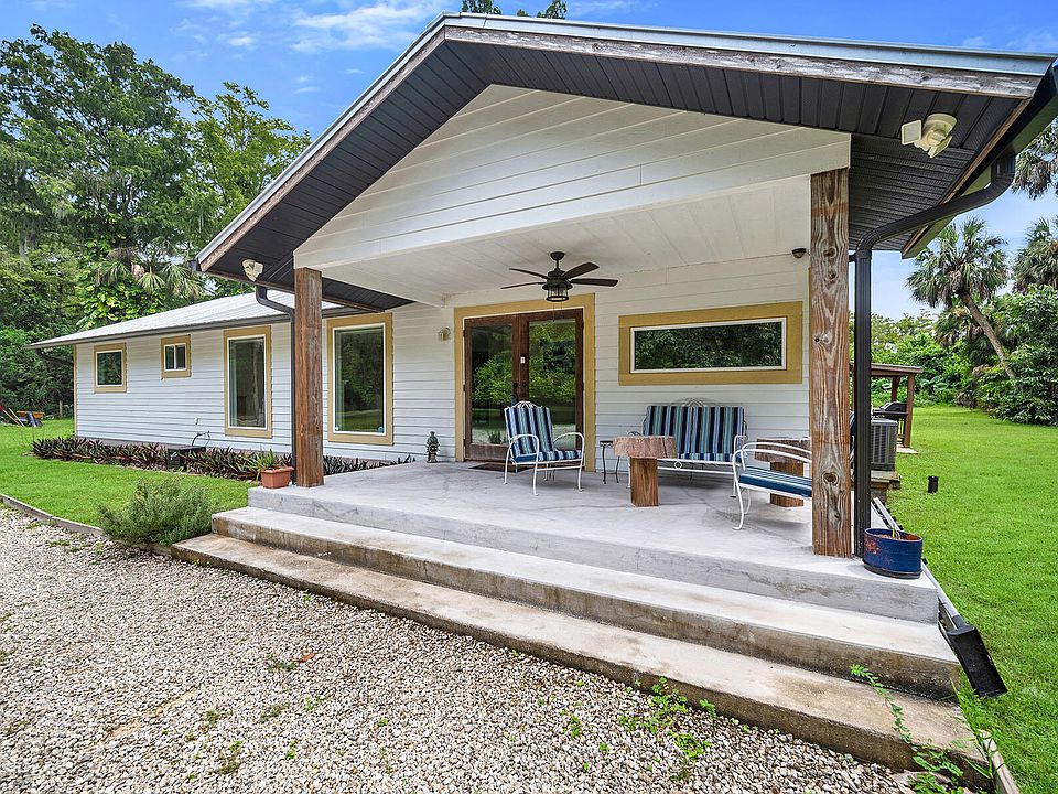 Check out this home in Paradise! You won't want to miss the opportunity to own this beautifully remodeled and updated residence, tucked away on 1.25 acres of private, lushly landscaped grounds in Golden Gate Estates. Perfectly positioned just two miles from Immokalee Road and Collier Boulevard, this property offers both privacy and convenience, with Publix, CVS, Walgreens, NCH hospital, restaurants, and shopping just minutes away. Designed for those who love nature and outdoor living, the home features an expansive new deck, outdoor patio with fire pit, covered BBQ area, and fruit trees, creating a serene retreat where every room enjoys garden views. This spacious three-bedroom plus den, three-bath home offers approximately 1,800 square feet under air with a flowing open concept floor plan, abundant natural light, and large windows framing peaceful greenery. Completely renovated with new wood-look tile flooring and a new waterproof subfloor, upgraded baseboards, and a new reverse osmosis system, the home blends modern updates with a relaxed, farmhouse-inspired charm. The den, currently set up as a family room, boasts a wood-plank ceiling, walls of windows, and direct access to the deck and backyard, and is conveniently served by a full bath with a walk-in shower, making it a flexible living space or private guest retreat. The upgraded kitchen is a showstopper, featuring crisp white cabinetry, quartz countertops, a tile backsplash, recessed lighting, pantry, island with bar seating, and new KitchenAid stainless steel appliances including electric cooktop, built-in wall oven, microwave, dishwasher, and refrigerator with icemaker. French doors in the adjacent dining area open seamlessly to the deck for easy indoor-outdoor entertaining. The owner's suite provides a private sanctuary with direct deck access, a walk-in closet with built-ins and storage room, and a spa-like en-suite bath with dual quartz vanities, a walk-in shower with bench, multiple shower heads, and frameless glass. Two guest bedrooms share a beautifully updated bath with dual sinks and a tub-shower combo. A dedicated laundry room adds convenience with newer Maytag washer and dryer, a utility sink, and overhead cabinets for extra storage. Exterior features include a new metal roof, a covered concrete front porch with ceiling fan overlooking the gardens, a covered outdoor sitting area, pole barn-style shed plus extra storage shed, and ample space to add a pool. Horses are welcome, and the property provides plenty of room to spread out and enjoy the natural surroundings. This property has been thoughtfully updated with countless improvements inside and out, offering the perfect blend of modern comfort and natural beauty, an ideal retreat surrounded by nature yet close to everything Naples has to offer.