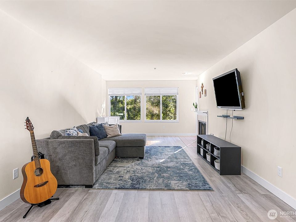Well kept Kenmore condo end unit in highly secure building, no stairs, elevator & gated parking. This unit is nestled between Bothell and Lake Forest Park. New flooring throughout unit. Updated kitchen. No rental cap. Serene views of greenbelt. Open concept kitchen w/ breakfast bar and adjacent dining area. Living room has a wood burning fireplace & private balcony. Full primary suite with private bath and large closet. Additional bedroom and office (possible additional bedroom) with large closets. Generous utility room w/lots of bonus storage. Fresh paint and well lit. Close to shopping, 405, downtown Kenmore, and the Burke Gilman trail.