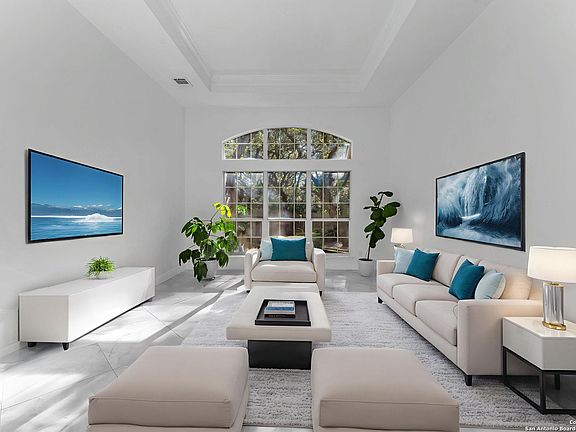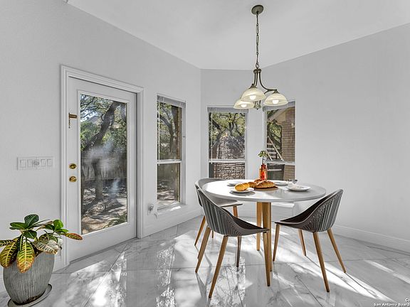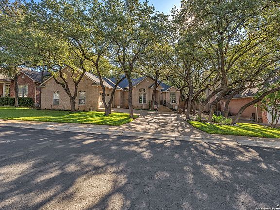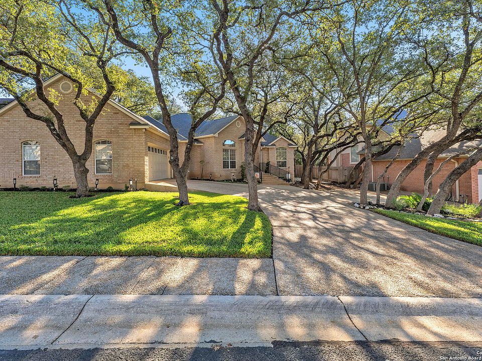 Welcome to this beautifully maintained single-story residence located in the prestigious, guard-gated community of Emerald Forest. Offering approximately 2,439 square feet of living space, this home sits on a generous, tree-shaded lot and combines timeless curb appeal with thoughtful modern updates. Inside, you'll find a spacious open floor plan designed for both everyday living and entertaining. The living area features vaulted ceilings, a cozy fireplace, and large picture windows that fill the home with natural light, creating a warm and inviting atmosphere. The kitchen has been tastefully updated with custom cabinetry, quartz countertops, and premium ceramic tile flooring, providing both style and function. Adjacent to the kitchen, the dining area offers an elegant space for family meals or gatherings with friends. The primary suite is privately situated and serves as a relaxing retreat with a large walk-in closet and a spa-inspired bath showcasing dual vanities, a soaking tub, and a separate shower. Two additional bedrooms provide flexibility for guests, a home office, or hobby space, each complemented by an updated full bath. Outside, enjoy a well-landscaped yard with mature trees and an oversized deck, perfect for outdoor dining, entertaining, or simply unwinding in the peaceful surroundings. The property has been lovingly cared for, with a newer roof, fresh exterior paint, and meticulous attention to detail throughout. Located within Emerald Forest, residents enjoy a secure, guard-gated environment and access to community amenities including a pool, tennis courts, sports courts, walking trails, and a clubhouse. The neighborhood's convenient North San Antonio location offers easy access to shopping, dining, highly rated schools, and major highways, ensuring comfort and convenience without sacrificing tranquility. Combining modern updates, classic design, and a premier location, 18210 Crystal Ridge Dr. is an exceptional opportunity to own a move-in-ready home in one of San Antonio's most desirable gated communities.