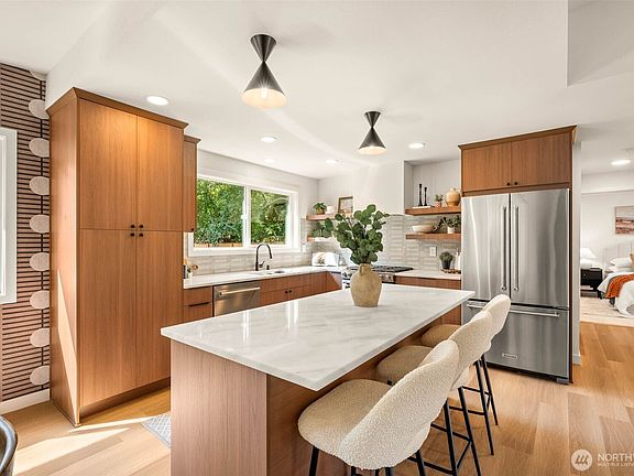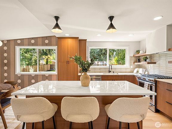 Stunning mid-century home in Edmonds’ Perrinville neighborhood. This spacious 4 bedroom, 2.75 bath home offers timeless mid-century charm with modern updates. Enjoy a bright upper-level primary suite with a huge walk-in shower, plus brand-new gas furnace and tankless water heater, fully permitted plumbing and electrical. The lower level features a cozy living room with fireplace, two additional bedrooms, and direct garage access, perfect for multi-generational living. A versatile sunroom/office opens to a 9,500 square foot fully fenced backyard. Exposed brick, sleek black windows, and thoughtful upgrades make this home a true standout.