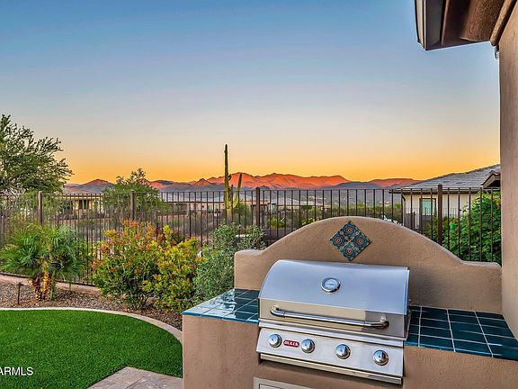 THIS BEAUTIFUL MOUNTAIN VIEW NICE MODEL HOME WAS TASTEFULLY DESIGNED WITH INDOOR/OUTDOOR LIVING IN MIND. The charming Spanish exterior gives way to a vibrant desert contemporary floor plan with upgraded corner sliding glass doors to the covered patio. Spend sunsets on the extended patio taking in incredible mountain views and then retreat to the covered patio to sit around the custom adobe fireplace. Come inside to the beautiful kitchen outfitted w/ a gas cooktop, Blanco sink and a large kitchen island. This popular floor plan opens to the great room and custom bar w/ wine fridge in the adjacent den/office. Other upgrades include custom window treatments throughout, a built-in gas grill, custom fans, smart space laundry room w/ built-in desks, premium landscape lighting and so much more.