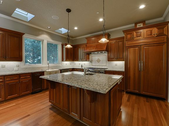 Kitchen includes slab granite counter tops, Brazilian cherry cabinetry, chef's island, butlers pantry. Flowing Brazilian cherry hardwood floors throughout most of the home. Upstairs boasts four bedrooms each with its own en suite bathroom. Master bedroom with fireplace and seating room, connects to the over-sized master bathroom which includes both his and her walk in closets & vanity areas. Deck, putting green, & four car garage.