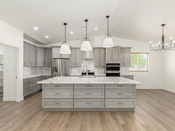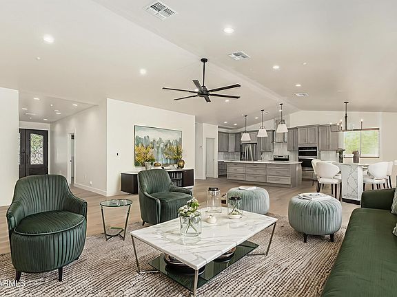Newly built 4-bedroom residence on over an acre lot with a 3-car garage and extended driveway. The open concept design features vaulted ceilings, recessed lighting, wood-look flooring, and a gourmet kitchen with quartz countertops, custom cabinetry, stainless steel appliances, a stylish backsplash, and a walk-in pantry. The primary suite offers private patio access and a spa-inspired bath with dual vanities, a soaking tub, tiled shower, and walk-in closet. Outside, enjoy a full-length covered patio with panoramic mountain views and endless space to design your outdoor oasis. This home is ideally located near shopping, dining, golf, and hiking trails with convenient access to Loop 303, providing both a luxury lifestyle and long-term value.