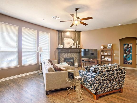Welcome home to this gorgeous 3 bed, 2 bath home. Warm colors and elegant archways throughout the house enhance its character and invite you to relax and unwind in the spacious living area with giant windows. The soaring ceilings of the entry lead into the great room which is the heart of the home with a gas fireplace accented in the same design as the kitchen backsplash tying the rooms together. The great room opens to the highly updgraded kitchen with a gas cooktop and easy access to the back, covered patio offering a natural gas connection for your grill. The kitchen features dark cabinets, quartz countertops, and backsplash coordinating with the fireplace. The large master suite offers the same high ceilings and windows as the great room and connects to an oversized master bath with dual sinks, walk in shower, and soaking tub. The two secondary bedrooms offer the same high celings and sizable closets. Plenty of storage throughout the home in a great community with lots of extras.