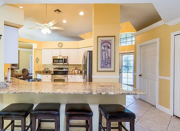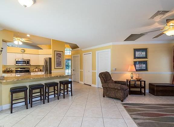 Terrific 4 BR, 2 BA, pool home in San Carlos Park. The front landscaping is very inviting as you approach the front door. You will find this home is light and bright and move in ready. Kitchen and both baths have been greatly improved . The kitchen is enhanced with granite countertops and breakfast bar, stainless steel appliances, and large pass thru window over kitchen sink. Dining room offers crown molding, chair rail, and accent diagonal tile. 2 separate sliders lead to the spacious screened lanai with inground pool for outdoor enjoyment. Both bathrooms have been upgraded with granite vanities. Master bath also offers accent tile, updated lighting, seamless shower door, 5 shower heads and seat . All bedrooms have wood laminate flooring. Inside laundry room with sink. Garage door works with remote app for extra security. Fenced area at back of home.