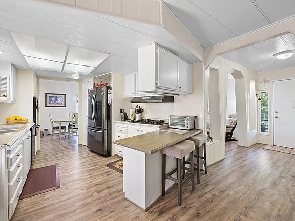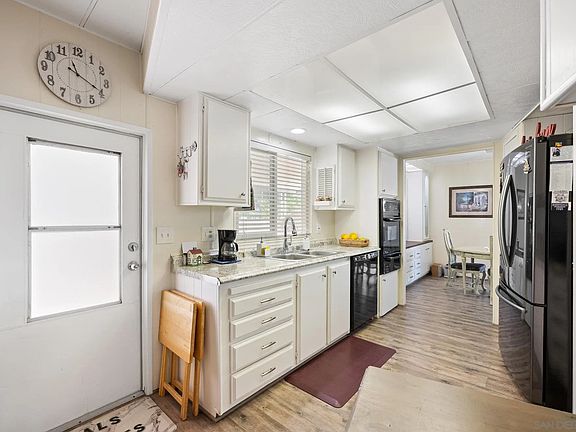 Retirement Golf Course Living!! Skyline Ranch Country Club a premier Senior Park that sits in the foothills of Valley Center. FREE golf membership to all residents. This home is located right on the golf course tee box. It has newer vinyl laminate flooring throughout, large walk-in closet, laundry room area, large shed, lovely landscaping, a perfect location in the park, and much more. The primary bathroom has a large vanity area & large soaker tub. Large deck/patio with Trex decking for entertaining, birds watching, or enjoying the golf course view. This home is your retirement dream home. Skyline Ranch Country Club additional amenities include full clubhouse use, gym, gated community, beautiful landscaping & water feature.