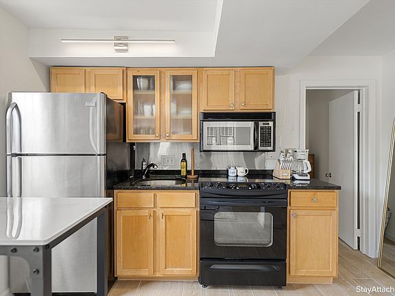 Step inside to a bright and updated living space featuring a wall of south-facing windows, porcelain tile floors, and tasteful furnishings that make the most of the studio layout. The well-equipped kitchen includes a microwave, oven, and all the essentials for everyday cooking. The sleeping area is furnished with a comfortable queen-size bed, and wireless internet is included for added convenience.