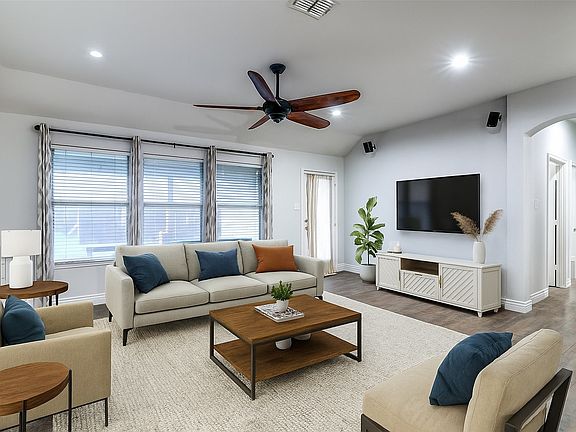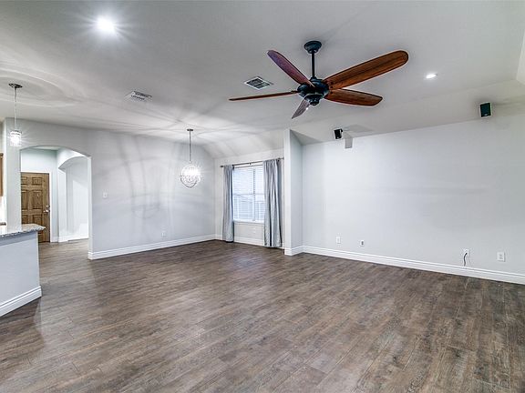 3 Bed 2 Bath with all the upgrades on a cul de sac oversized lot!! This home is freshly painted inside and out and greets you with a wonderful covered front porch before entering into beautiful wood look tile throughout. The bedrooms are split with a large open living, kitchen and dining room. Upgrades everywhere, custom lighting, granite counters, surround sound with speakers, custom built out laundry with washer and dryer included. Upgraded appliances, base boards and fixtures. Backyard is HUGE with an oversized covered patio and tons of space! Check it out and make it your perfect home.